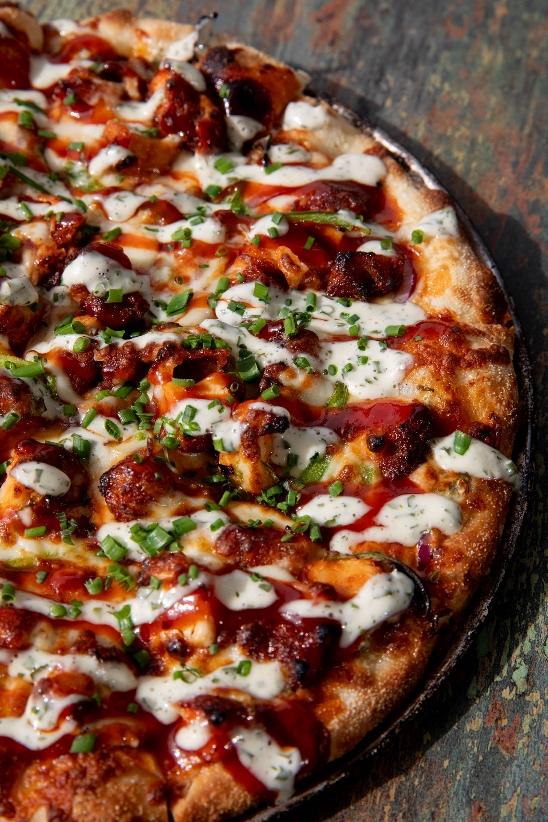 Pizza Sauce, Mozzarella, Roasted Chicken, Spanish Onions, Roasted Capsicum, Bacon, Pesto Aioli
